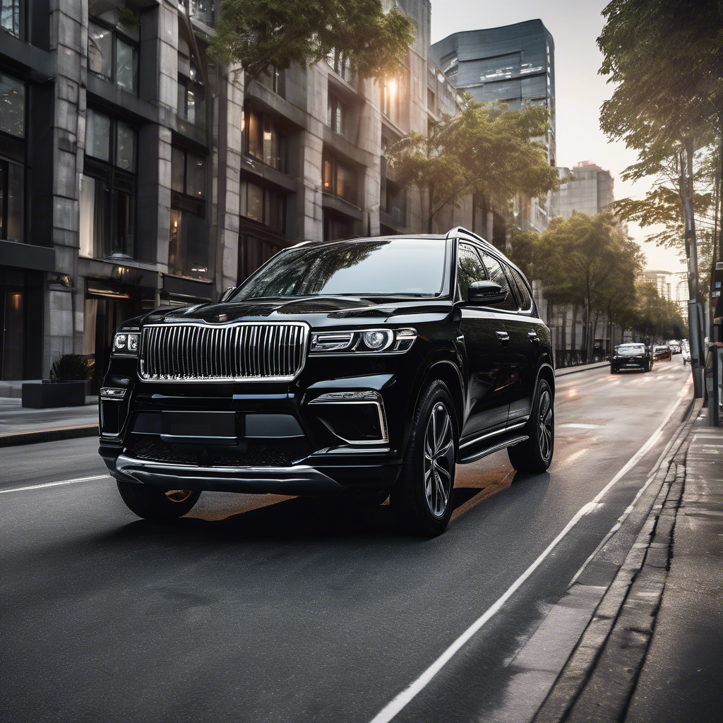 A stunning midnight black SUV on a modern city street, professional automotive photography, high quality, detailed