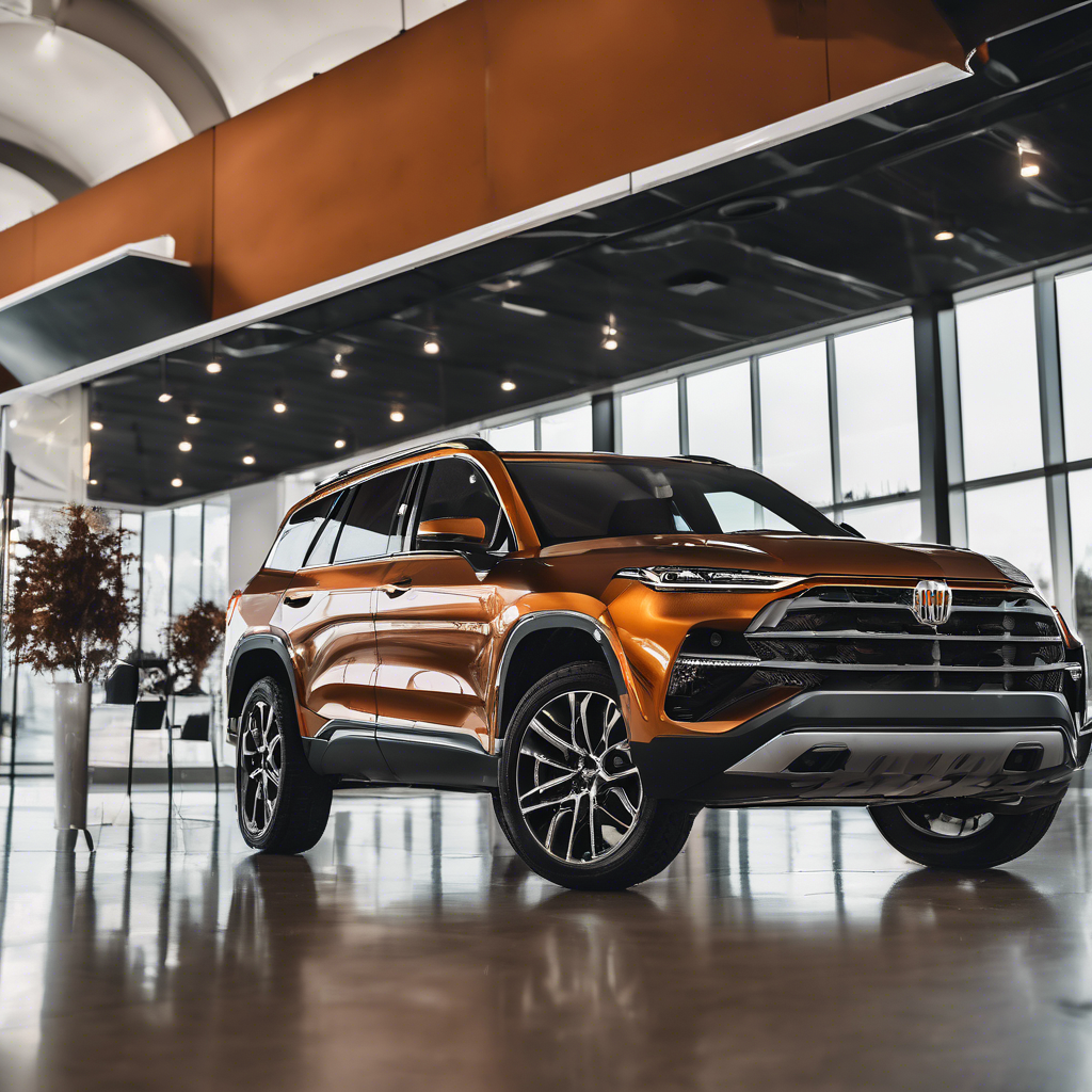 A stunning rust SUV on a dealer showroom, professional automotive photography, high quality, detailed