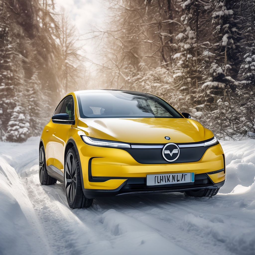 A stunning yellow electric vehicle on a snowy road, professional automotive photography, high quality, detailed