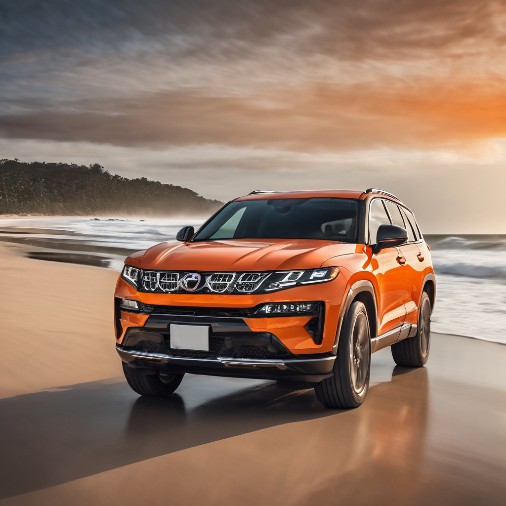A stunning orange SUV on a beach highway, professional automotive photography, high quality, detailed