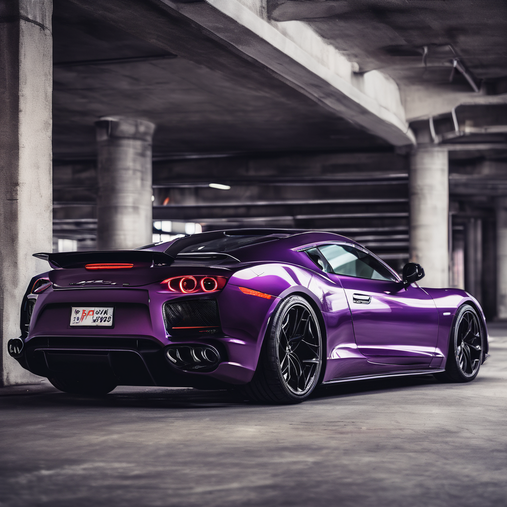 A stunning purple sports car on a urban parking garage, professional automotive photography, high quality, detailed