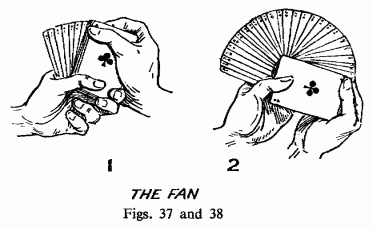 [Note: The thumb fan is one of the most elegant and practical flourishes in card magic. The reference to “modern colorful bridge packs” indicates the authors were writing during the era when colored card backs were becoming popular, particularly in the 1920s-1940s. The mention of the “famous Diminishing Cards trick” refers to a classic stage illusion where progressively smaller fans of cards are produced, creating a striking visual effect. The versatility described here – creating different fan sizes and patterns – demonstrates how a single technique can be adapted for various performance contexts and aesthetic preferences. – RJW]