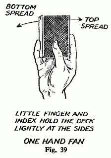 4. Spread the cards in a fan by an opposite pressure of the thumb and fingers very similar to that used in snapping the fingers. When the cards are completely fanned they are grasped by the index finger only, at the face, with the fan resting along the palm and the length of the thumb at the back.
