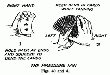 [Note: The pressure fan represents the evolution of card flourishes toward more sophisticated, mechanically precise techniques. The authors’ emphasis on it being a “modern” method indicates this was a relatively recent development in their era, showing how card manipulation was continuously evolving. The guaranteed symmetry of this method makes it particularly valuable for professional presentations where visual perfection is crucial. The technique’s utility “in offering the cards for a choice” demonstrates how flourishes serve both aesthetic and practical purposes in performance. – RJW]