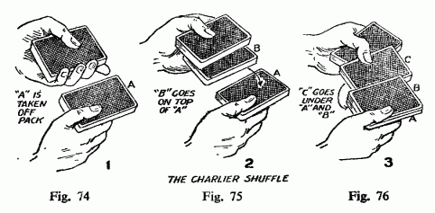 This shuffle is also called the “haymow” shuffle. [Note: The term “haymow” refers to a storage area for hay in a barn, suggesting the rough, agricultural appearance of this shuffle technique. The Charlier Shuffle is named after a French magician, though its exact origins are disputed. – RJW] It is unique among card sleights in that neatness of execution is not required; in fact, it is most effective when done rather clumsily. Although expert cardmen affect to disdain it for that reason, the wise operator values it for its effect on laymen, to whom it is the most convincing false shuffle extant. The shuffle, though apparently thoroughly mixing the cards, really leaves them in the same condition that a simple complete cut would do. The moves are:
