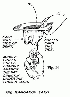 - “I call this the kangaroo card trick,” you explain, “because some of the cards jump like kangaroos.” Snap the crown of the hat with your index finger at the side which contains the chosen card (Fig. 84), making it fly up out of the hat very much like a startled kangaroo.