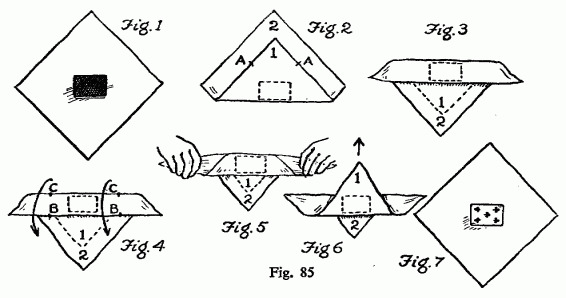 - Place the folded handkerchief on the pack (as shown in Fig. 85-4), with the hidden card directly over the pack.